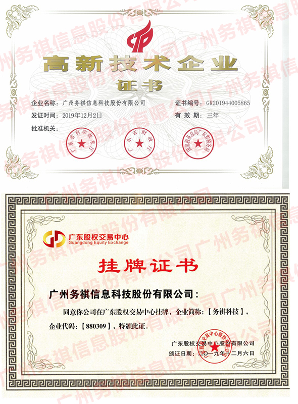 公司于2019年成功申请并通过了国家高新企业认证,广东股权交易中心新四板挂牌